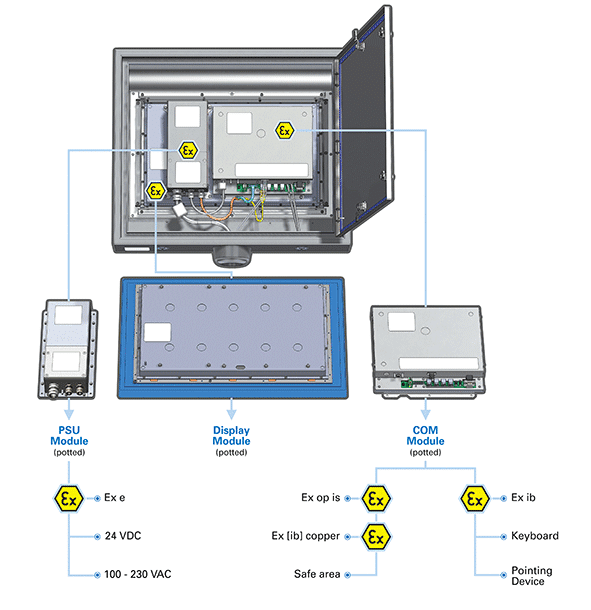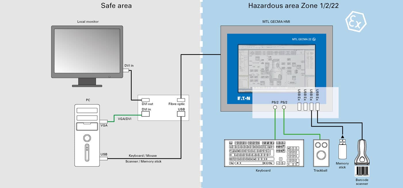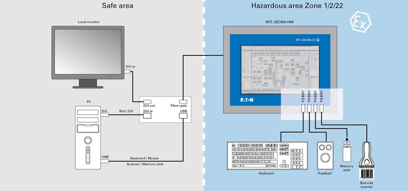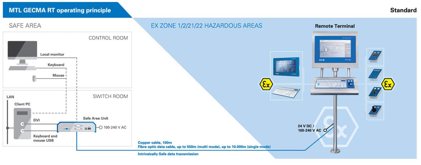 Eaton’s MTL GECMA RT is a keyboard, video and mouse (KVM) extension of either a safe area Personal Computer or Thin Client and can be installed into Ex Zone 1/2/21/22 hazardous areas.